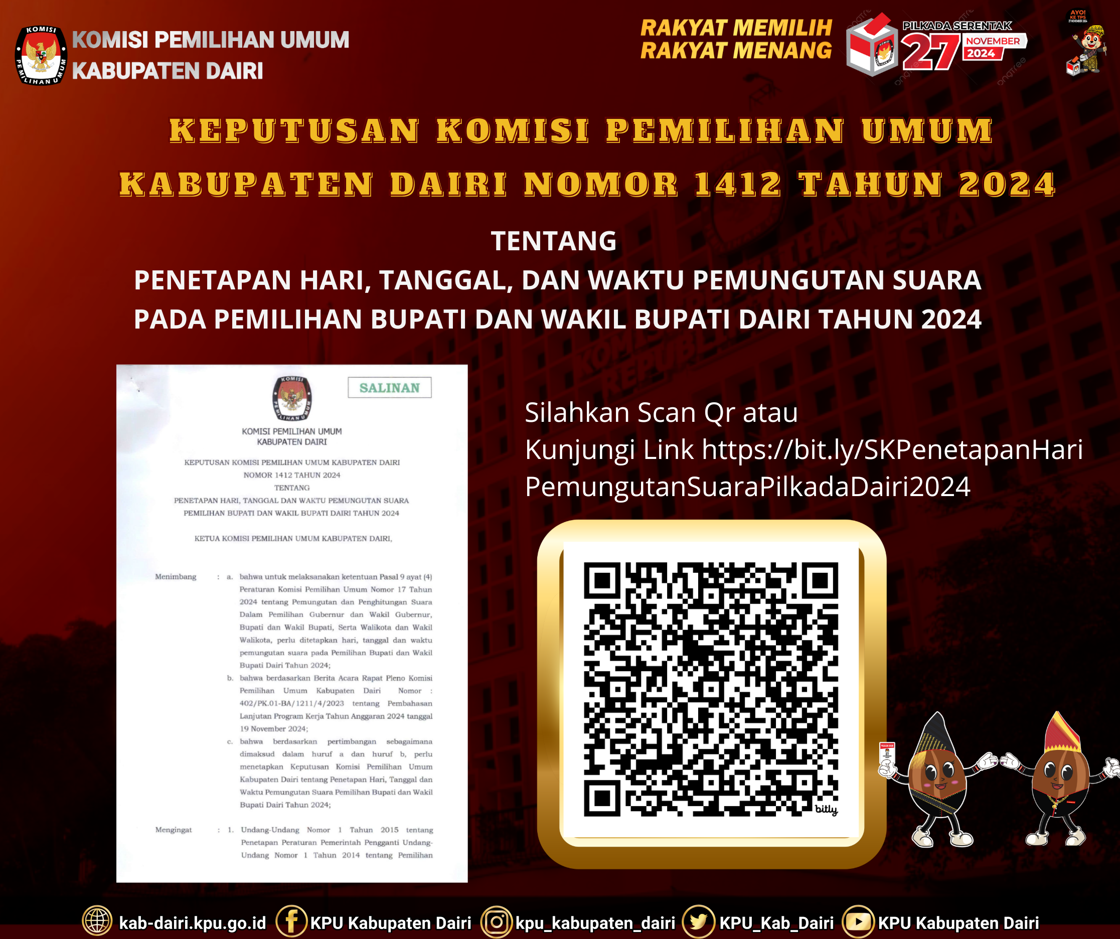 berikut disampaikan Keputusan Komisi Pemilihan Umum Kabupaten Dairi Nomor 1412 Tahun 2024 tentang Penetapan Hari, Tanggal dan Waktu Pemungutan Suara pada Pemilihan Bupati dan Wakil Bupati Dairi Tahun 2024.