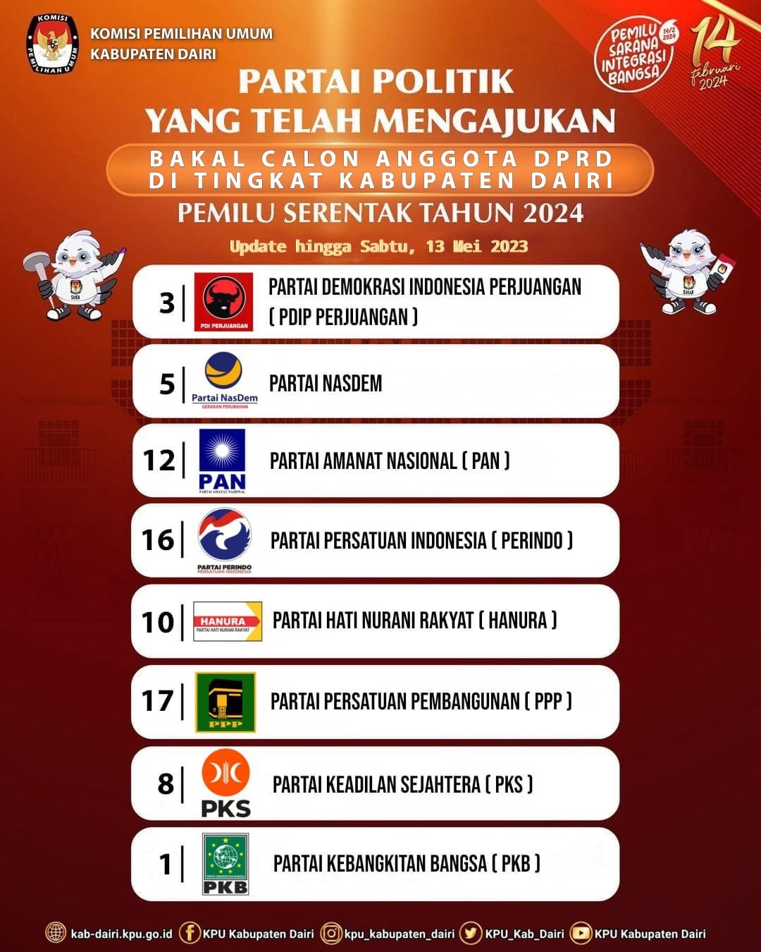 Sampai dengan hari ke 13 penerimaan Pendaftaran dan Pengajuan Bakal Calon anggota DPRD Kabupaten Dairi sudah 8 Partai Politik yang telah menyerahkan dokumen persyaratan dan masih berlanjut sampai dengan tanggal 14 Mei 2023 Pukul 23.59 WIB.