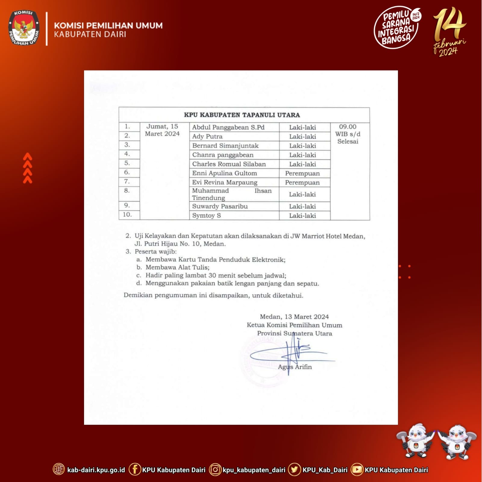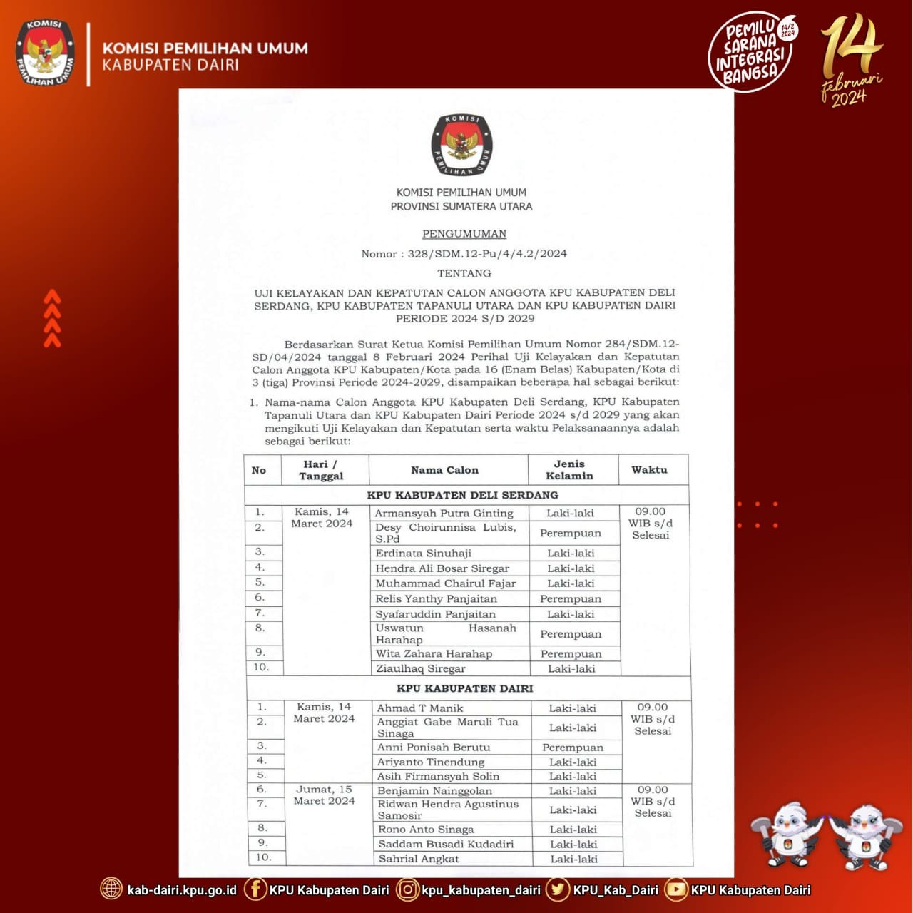 #TemanPemilih, Berikut kami sampaikan Pengumuman Nomor : 328/SDM.12-Pu/4/4.2/2024 tentang Uji Kelayakan dan Kepatutan Calon Anggota KPU Kabupaten Deli Serdang, KPU Kabupaten Tapanuli Utara dan KPU Kabupaten Dairi.