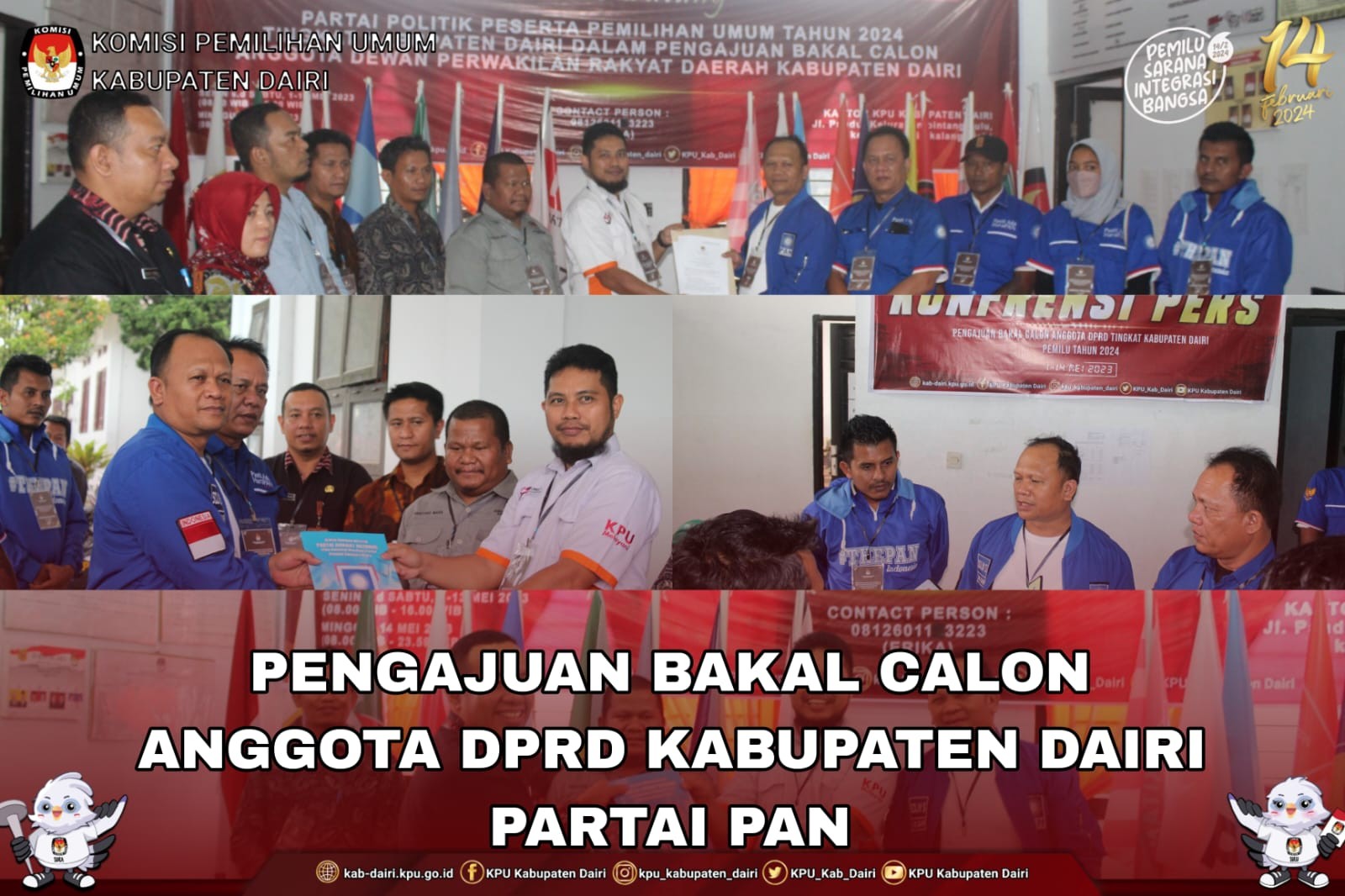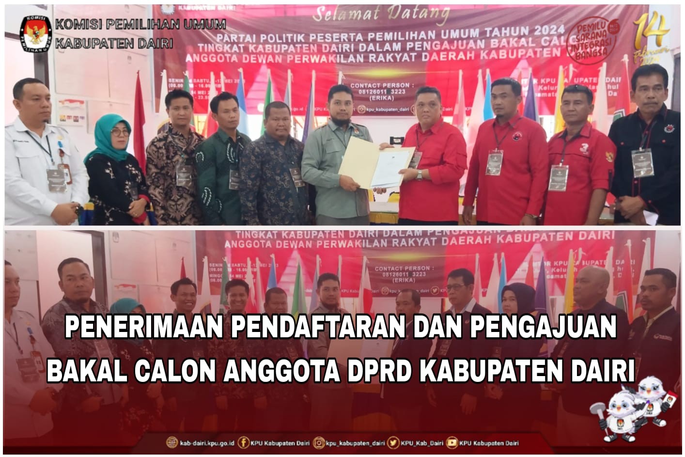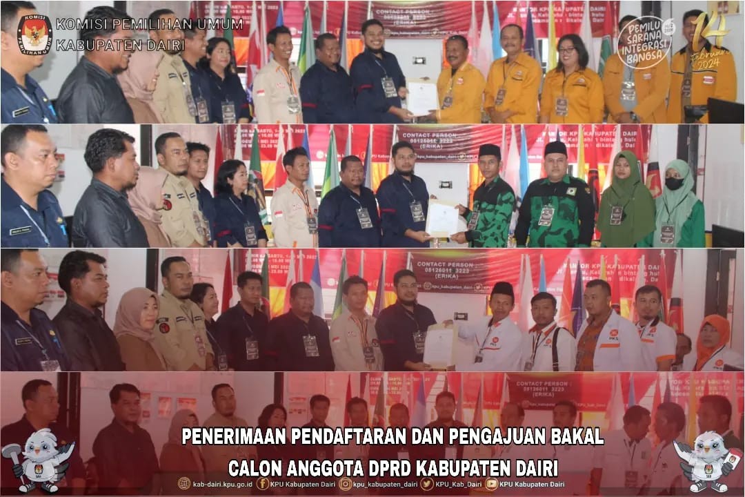 #TemanPemilih, KPU kabupaten Dairi telah menerima pengajuan bakal calon anggota Dewan Perwakilan Rakyat Daerah (DPRD) Kabupaten Dairi untuk Pemilu Serentak tahun 2024 Hari ke 13, di Kantor KPU Kabupaten Dairi Sabtu, 13 Mei 2023. Pengajuan telah dilaksanakan oleh Partai Politik berikut: - Partai PDI Perjuangan - Partai Nasdem - Partai PERINDO - Partai PAN - Partai HANURA - Partai PPP - Partai PKS - Partai PKB Dalam pelaksanaannya, bakal calon mengikuti prosedur penerimaan yang digunakan oleh KPU Kabupaten Dairi. Setelah diperiksa oleh tim yang telah ditugaskan, dokumen persyaratan bakal calon Anggota DPRD Kabupaten Dairi, Partai Hanura, Partai PPP, Partai PKS dan Partai PKB dinyatakan benar dan lengkap. Selanjutnya bakal calon menerima tanda terima dan berita acara penerimaan dokumen pendaftaran dari Ketua dan Anggota KPU Kabupaten Dairi serta disaksikan oleh Ketua dan Anggota Bawaslu Kabupaten Dairi. Kemudian KPU Kabupaten Dairi memberikan kesempatan kepada bakal calon Anggota DPRD Kabupaten Dairi untuk melakukan Konferensi Pers. Sampai dengan hari ke 13 penerimaan Pendaftaran dan Pengajuan Bakal Calon anggota DPRD Kabupaten Dairi sudah 8 Partai Politik yang telah menyerahkan dokumen persyaratan dan masih berlanjut sampai dengan tanggal 14 Mei 2023 Pukul 23.59 WIB. #KPUMelayani #PemiluSerentak2024
