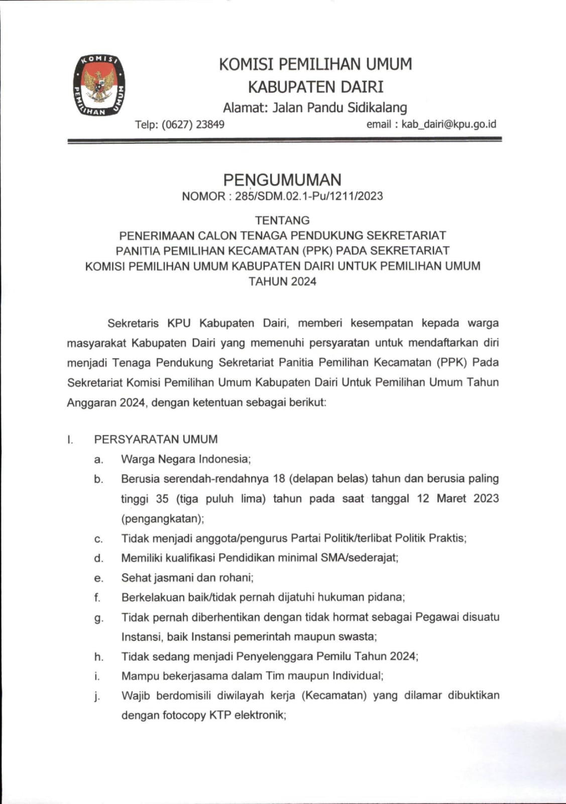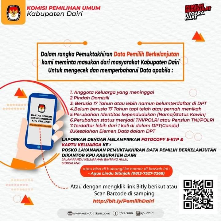 Dalam rangka Pemutakhiran Data Pemilih Berkelanjutan Tahun 2021, Komisi Pemilihan Umum Kabupaten Dairi meminta masukan dari masyarakat Kabupaten Dairi untuk mengecek dan memperbarui data sesuai dengan flyer di bawah ini dengan melaporkan ke Posko Layanan Pemutakhiran Data Pemilih Berkelanjutan Tahun 2021 di Kantor KPU Kabupaten Dairi yang beralamat di Jalan Pandu, Bintang Hulu, Sidikalang atau melalui link berikut ini : http://bit.ly/PemilihDairi