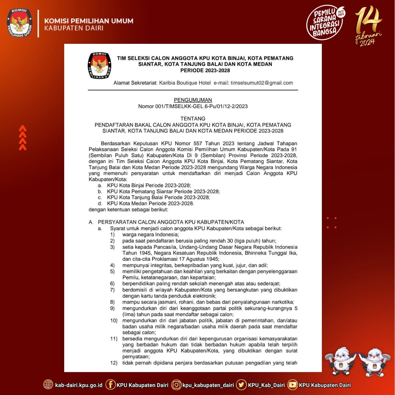 Pendaftaran Bakal Calon Anggota KPU Kota Binjai, Kota Pematang Siantar, Kota Tanjung Balai dan Kota Medan Periode 2023-2028. Jumat, 14 Juni 2013 12:20 377 #TemanPemilih, Berikut Pengumuman Nomor 001/TIMSELKK-GEL.6-Pu/01/12-2/2023 tentang Pendaftaran Bakal Calon Anggota KPU Kota Binjai, Kota Pematang Siantar, Kota Tanjung Balai dan Kota Medan Periode 2023-2028. UNDUH DISINI Baca Selengkapnya