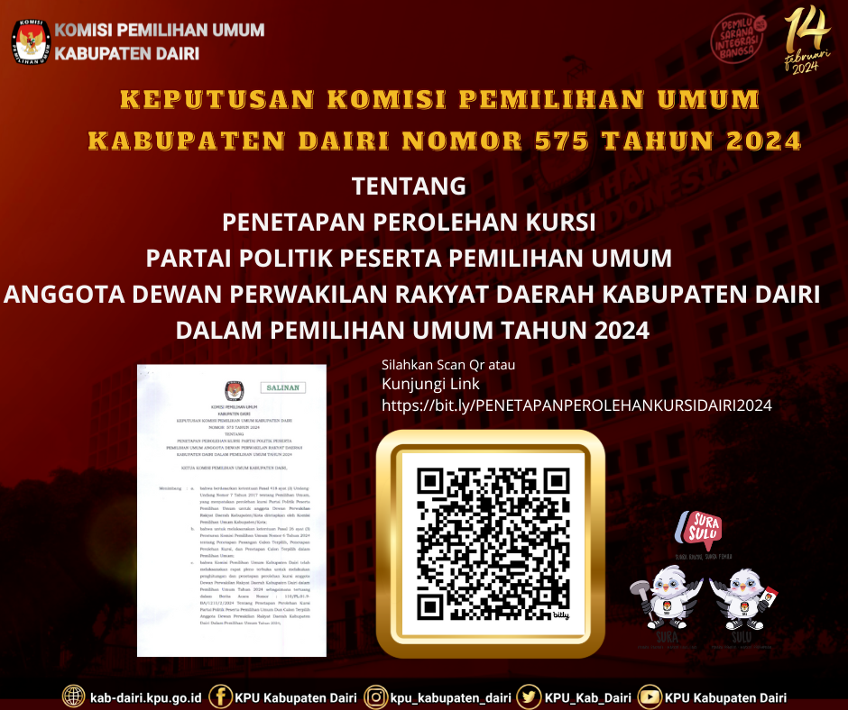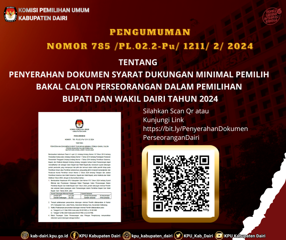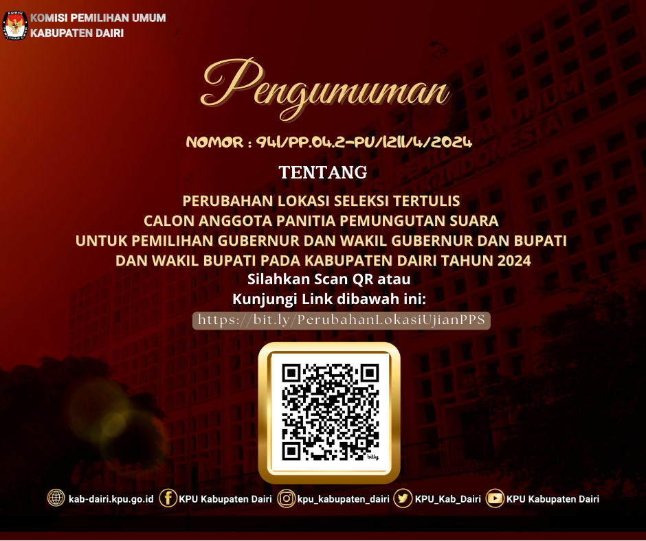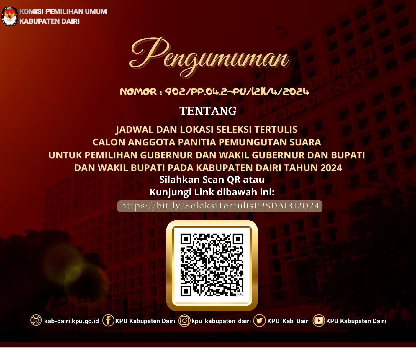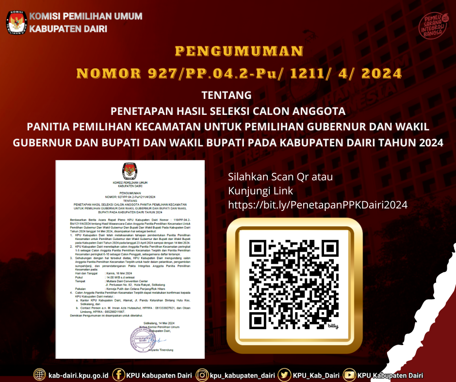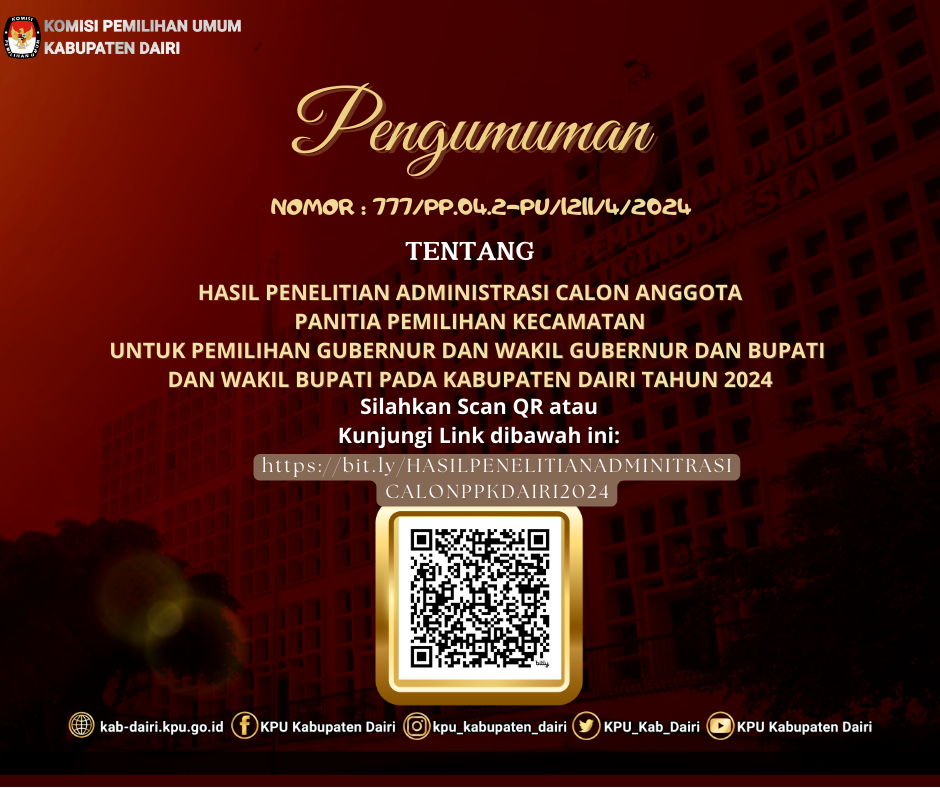 #TemanPemilih, Berikut kami sampaikan Pengumuman Komisi Pemilihan Umum Kabupaten Dairi Nomor 777/PP.04.2-PU/1211/4/2024 Tentang Hasil Penelitian Administrasi Calon Anggota Panitia Pemilihan Kecamatan Untuk Pemilihan Gubernur Dan Wakil Gubernur Dan Bupati Dan Wakil Bupati Pada Kabupaten Dairi Tahun 2024