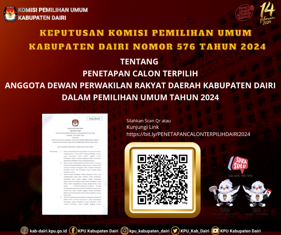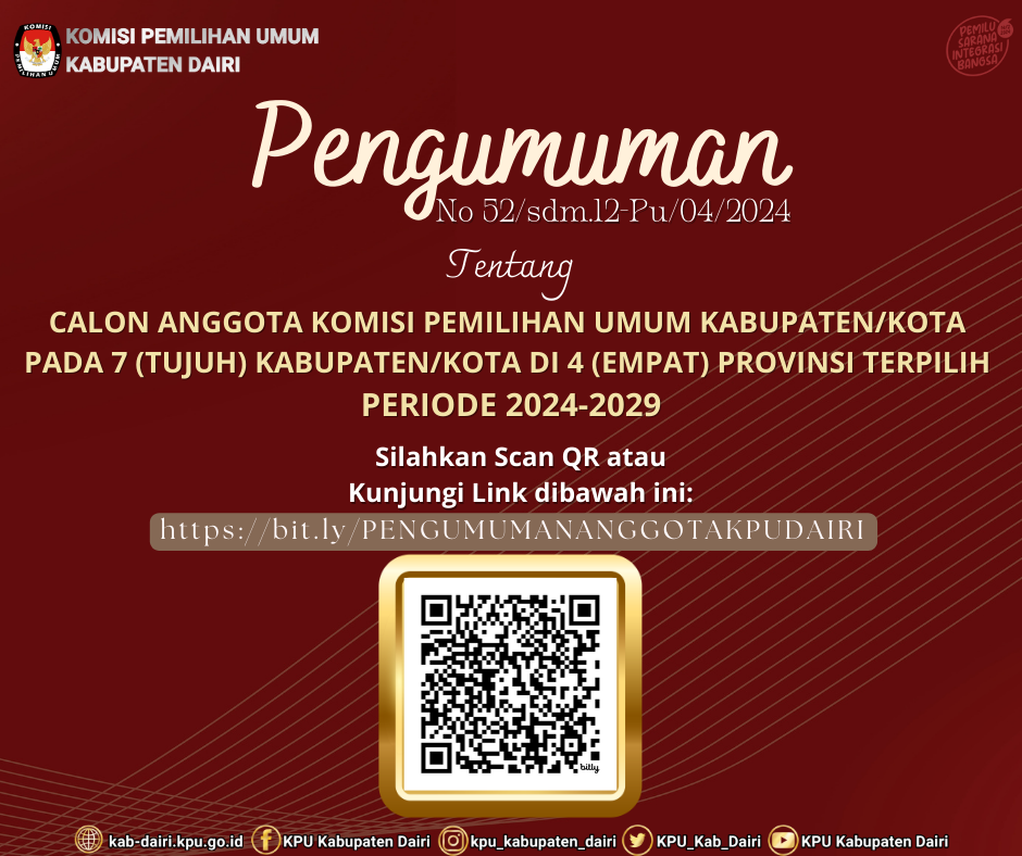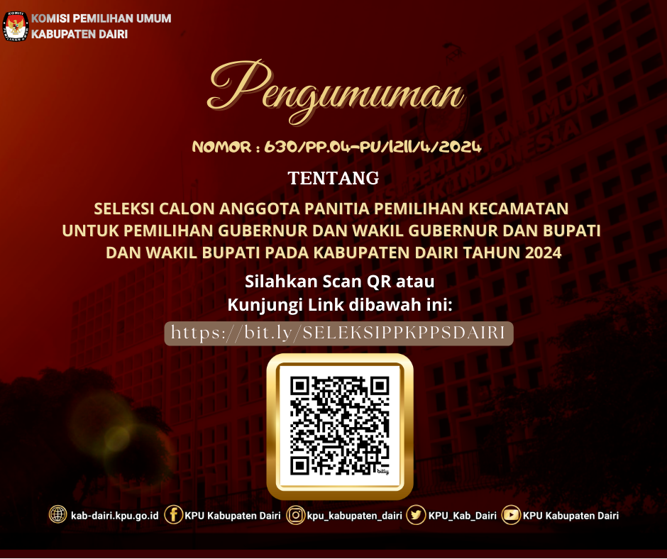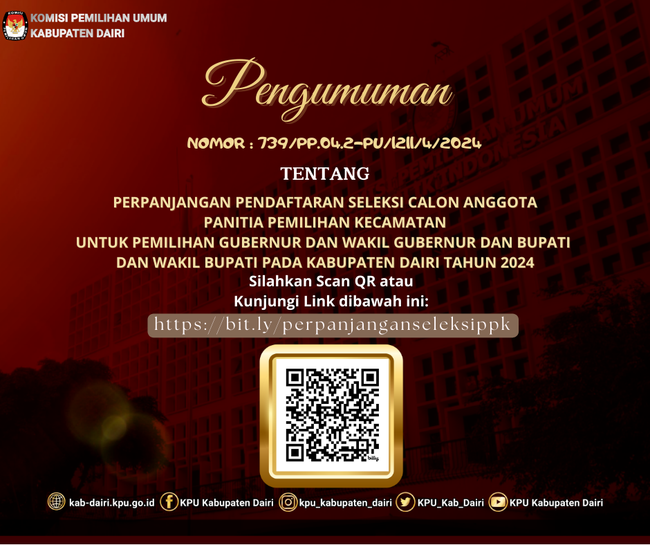 #SahabatPemilih, pengumuman perpanjangan pendaftaran seleksi Calon Anggota Panitia Pemilihan Kecamatan (PPK). Pada Pemilihan Gubernur dan Wakil Gubernur, Bupati dan Wakil Bupati Kabupaten Dairi Tahun 2024. Pada Kecamatan Sebagai berikut.